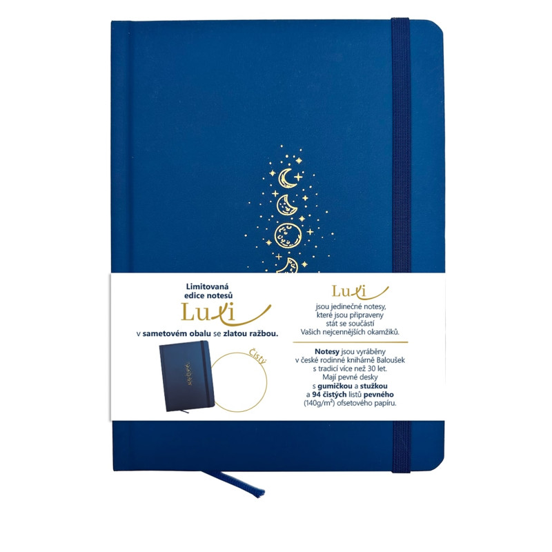 limitovaná edice notesů s prázdným blokem se sametovým přebalem v moderní tmavě modré barvě a se zlatým motivem Vesmíru, jedinečný sametový povrch, kvalitní vysokogramážní papír, 192 stran, 96 listů, notesy Luxi se stuhou a gumičkou pro všechna vaše tvoření a psaní, zapisujte si všechny poznámky a myšlenky stylově a elegantně, rozměry 148×210 mm (A5)