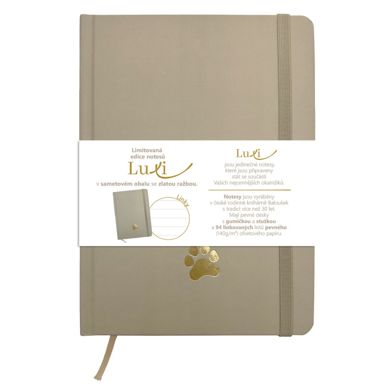 limitovaná edice linkovaných notesů se sametovým přebalem v moderní moka barvě a se zlatým motivem Tlapičky, jedinečný sametový povrch, kvalitní vysokogramážní papír, 192 stran, 96 listů, notesy Luxi se stuhou a gumičkou pro všechna vaše tvoření a psaní, zapisujte si všechny poznámky a myšlenky stylově a elegantně, rozměry 148×210 mm (A5)
