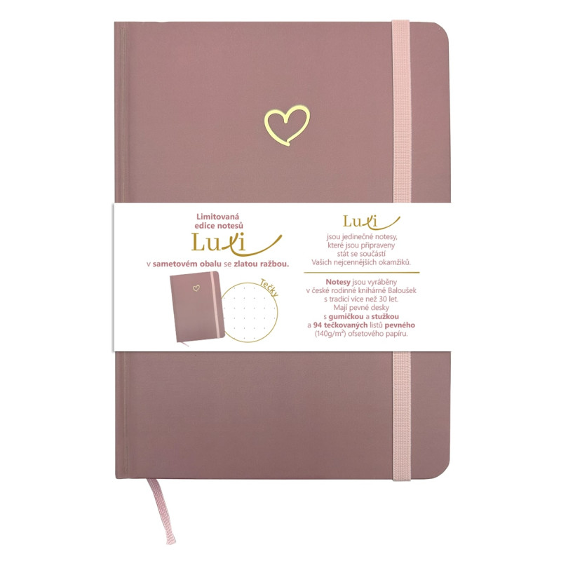 limitovaná edice notesů s tečkovaným blokem se sametovým přebalem v moderní starorůžové barvě a se zlatým motivem Srdíčka, jedinečný sametový povrch, kvalitní vysokogramážní papír, 192 stran, 96 listů, notesy Luxi se stuhou a gumičkou pro všechna vaše tvoření a psaní, zapisujte si všechny poznámky a myšlenky stylově a elegantně, rozměry 148×210 mm (A5)