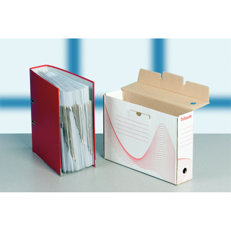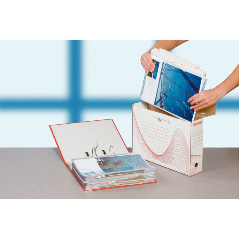 ideální řešení pro archivaci dokumentů vyjmutých z pořadače, pevná konstrukce s dvojitými postrannými stěnami, pojme obsah běžného pořadače šíře hřbetu 75/80 mm, snadno sestavitelné podle návodu natištěného na krabici, pro dokumenty formátu A4, vyrobeno ze 100% recyklované vlnité lepenky, 100% recyklovatelné, certifikováno FSC®