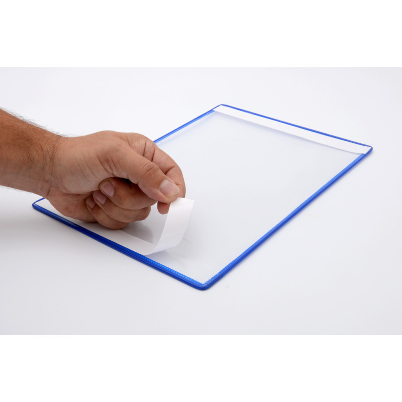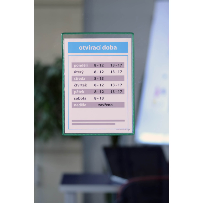 nerozbitný samolepicí flexibilní odolný rámeček s kapsou, bezproblémové přemístění bez stop lepidla, vyztužený ocelovým drátem, univerzální použití, chrání dokumenty před nečistotami a vlhkem, snadná výměna dokumentů, formát A4 otevřený shora, 2 samolepicí pruhy s nepermanentním lepidlem, antireflexní odolné PVC, balení 5 ks