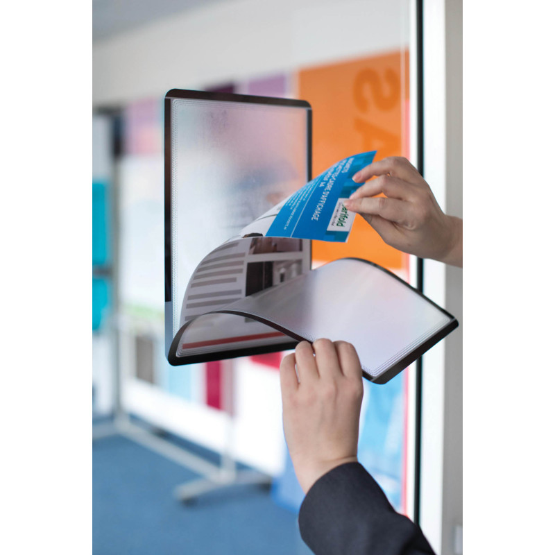 designový rámeček se zaoblenými rohy, snadné a rychlé vkládání dokumentů díky širokému otevření ze tří stran, prezentace na hladkých plochách, fixace dokumentů magnetickými lemy, přemístění bez stop lepidla, vhodný do obchodů, hotelů, restaurací, průmyslu a škol, ideální na prosklené plochy s čitelností z obou stran, formát A3 otevřený ze tří stran, orientace vertikální i horizontální, nepermanentní samolepicí zadní strana, antireflexní PVC 250 μm, tečkovaný tisk pro zvýraznění informací