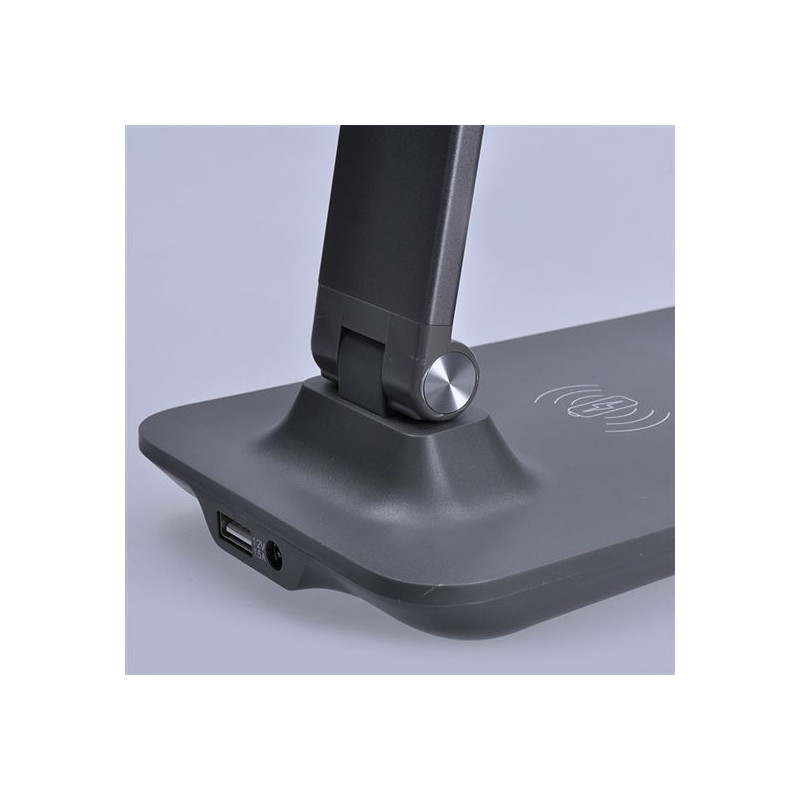 hliníková LED stolní lampička, 3-stupňové stmívání, teplota světla 3000K/4500K/6000K, bezdrátové Qi nabíjení 5W, USB port 5V/1A, příkon 10W, světelný tok 400 lm, úhel svícení 120°, CRI > 80, napájení AC 100–240V / DC 12V, rozměry základny 120×190 mm, ramena 350×40×7 mm, délka kabelu 140 cm, barva šedá, materiál hliník