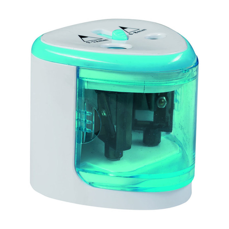 stolní ořezávátko na baterie v elegantním trojbokém designu pro rychlé a bezpečné ořezávání bez námahy, dokonale ořezává kulaté, trojhranné i hexagonální tužky či pastelky o průměrech 6 až 8 mm a 9 až 12 mm, širší otvor je navíc zabezpečen pojistkou proti poranění, praktický pomocník v domácnostech, úřadech i firmách, napájeno čtyřmi tužkovými bateriemi AA, snadno vyměnitelná náhradní ořezávátka (nejsou součástí balení)