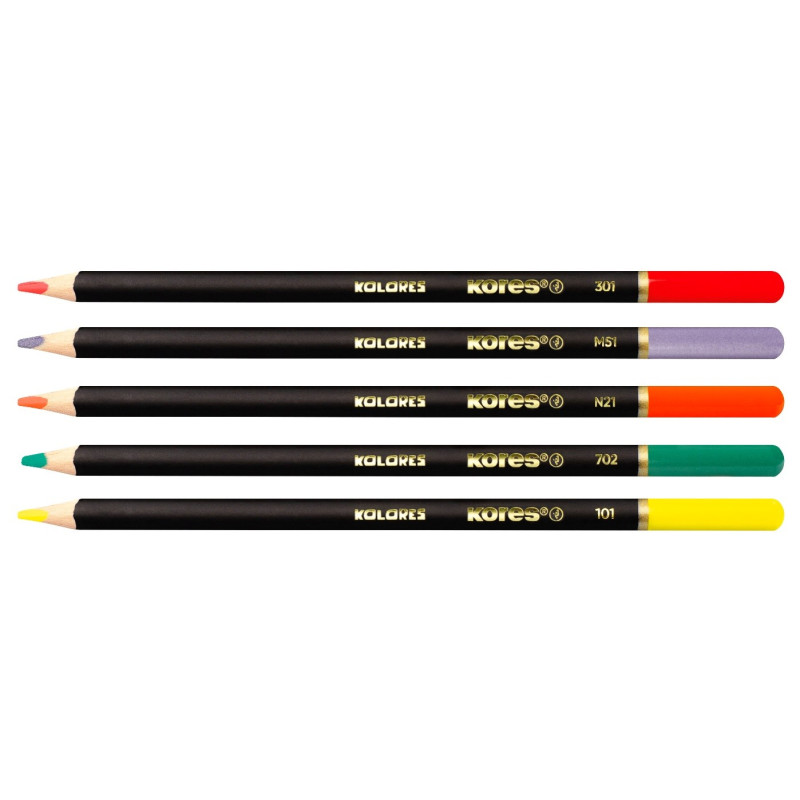 prémiová kolekce trojhranných pastelek Kolores Selection, v elegantním kovovém pouzdře, zářivé barvy díky vysokému obsahu pigmentu, jemné a plynulé vedení pastelky – intenzivní a jasné barvy, z vysoce kvalitního dřeva pro snadné ořezávání, ideální pro umělecké a hobby kreslení, nelámavé, trojhranný tvar pro pohodlné kreslení