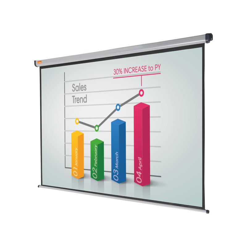 Zářivý matně bílý povrch plátna zaručuje ostrý, podrobný obraz, který zřetelně uvidí všichni diváci. Lze je snadno zasunout do pouzdra, aby bylo chráněno před poškozením, nebo uloženo, když není používáno. Doplňkové držáky umožňují instalovat plátno před popisovací tabuli nebo je sklonit směrem k divákům.
