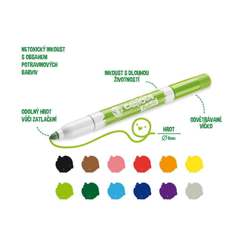 Textilní fixy Carioca, extra silný hrot ø 6 mm pro snadné vyplnění ploch, určené na textil, po aplikaci permanentní, netoxické, jasné a zářivé barvy, odolné vůči praní až do 60 °C, odvětrávané víčko, vyrobeno v Itálii, obsah balení 12 ks, nevhodné pro děti do 3 let