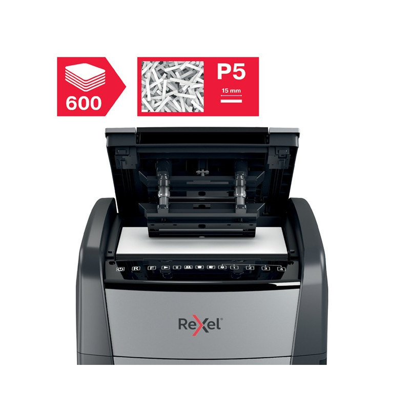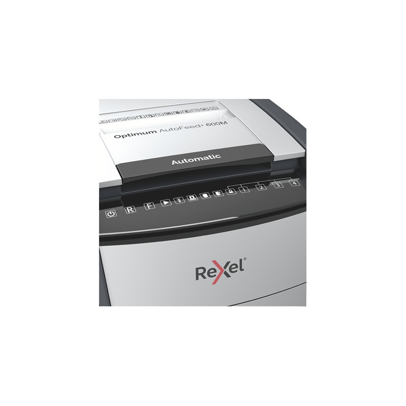 Skartovačka Optimum AutoFeed 600M automaticky skartuje až 600 listů papíru A4 (80 g/m²) mikro řezem P-5 (2 × 15 mm). Jedná se o sofistikovaný kancelářský skartovač s automatickým podáváním, který nevyžaduje ruční vkládání papíru ani odstraňování svorek či kancelářských sponek.