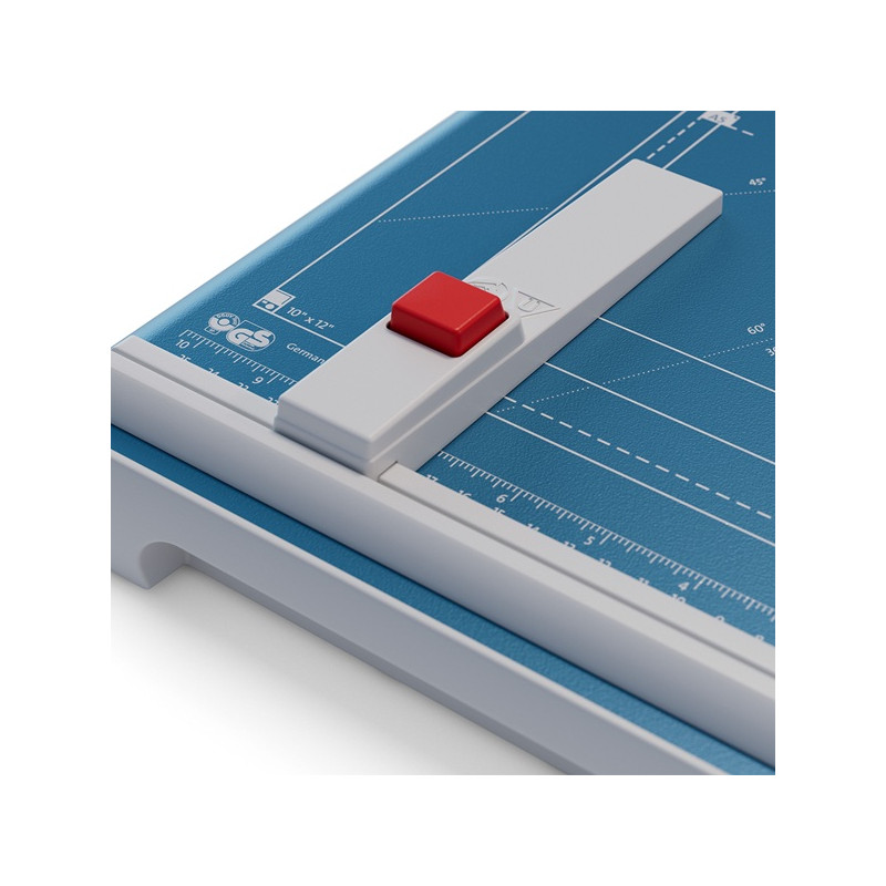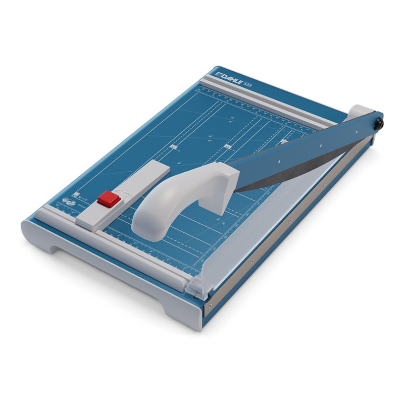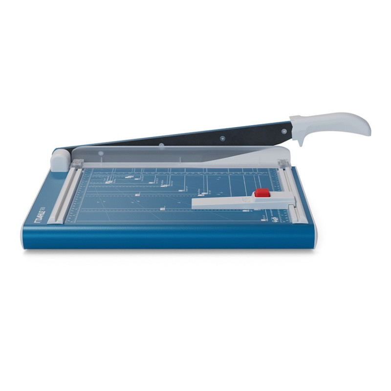 Spolehlivá páková řezačka pro kancelář i školu. Vysoce kvalitní nože Solingen - spodní ostrý nůž a horní s plochým ostřím pro bezpečnou manipulaci. Přesný řez je zaručen ocelovým zpevněním přítlačného ramene. Určeno pro více druhů materiálů: papír, karton, textil, fotografie a fólie. Stabilní kovový stůl se zaoblenými hranami a neklouzavými pryžovými patkami. Natištěné úhly a DIN formáty usnadňují přesné vyrovnání řezaného materiálu. Dva příložníky s dělením v mm a nastavitelným zadním dorazem pro fixaci řezaného materiálu a přesný řez 90°. Vyměnitelný horní nůž s plochým ostřím. Manuální přítlak s integrovanou ochranou prstů pro bezpečnou fixaci řezaného materiálu. Praktické úchyty pro přenos. Ergonomicky tvarovaná rukojeť zajistí pohodlné řezání. Vyrobeno v ČR. Váha: 3,9 kg. Rozměr stolu: 450 x 285 mm. Délka řezu: 340 mm. Výška řezu: 1,5 mm. DIN: A4. Řezný výkon: 15 listů papíru (80 g/m2).