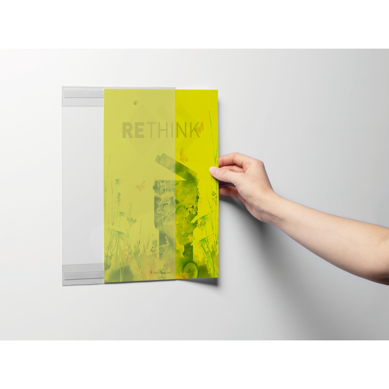 pro použití na výšku i na šířku na veškerých hladkých plochách i nerovných (čistých a stabilních), přilne na veškeré hladké plochy díky dvěma samolepicím proužkům na zadní straně, snadná výměna dokumentu vložením ze strany kapsy, fólie vyrobená z 80 % z materiálu rPET (recyklace odpadů po spotřebiteli), samolepicí proužky lze oddělit od plastové části takže je kapsa plně recyklovatelná, cena za balení, které obsahuje 5 ks