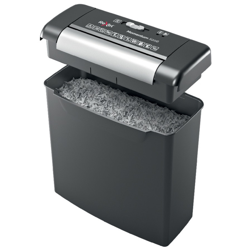 Skartovačka Rexel Momentum S206 skartuje až 6 listů najednou a je ideální pro domácí použití. Nabízí proužkový řez P-2, který rozděluje papír na proužky o šířce 6 mm.