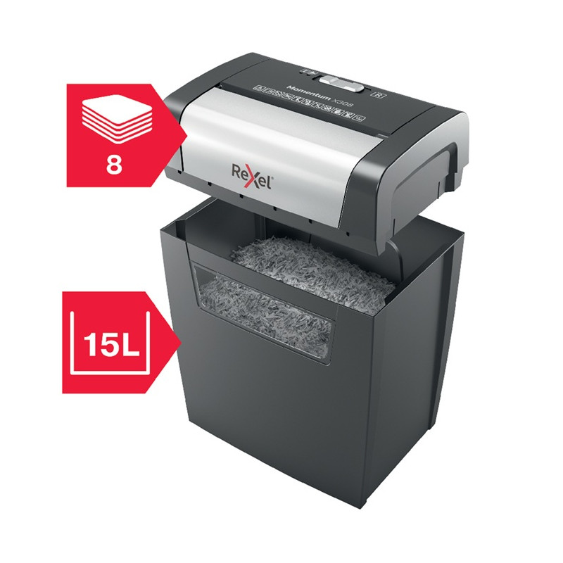 Skartovačka Rexel Momentum X308 skartuje až 8 listů najednou a je vhodná pro domácí použití. Nabízí křížový řez na úrovni zabezpečení P-3, který rozděluje papír na částice o velikosti 5 × 42 mm.