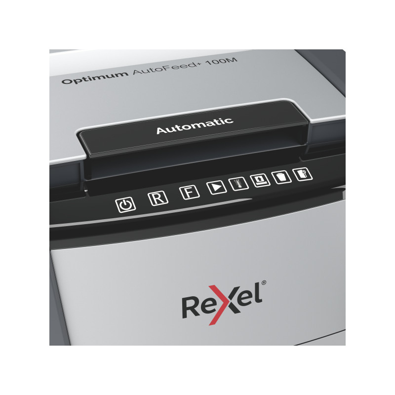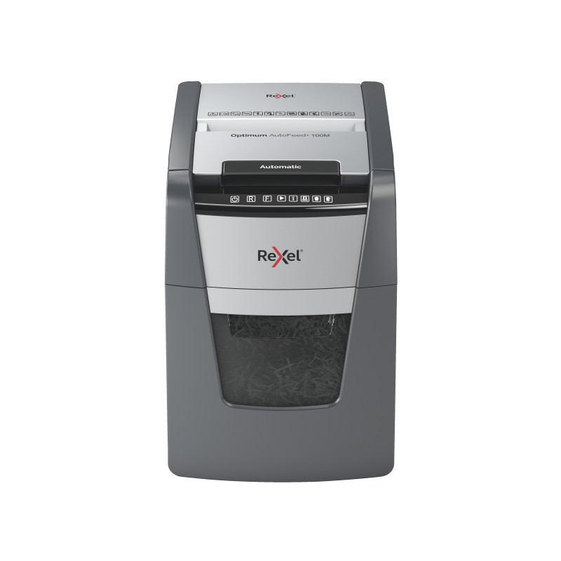 Skartovačka Optimum AutoFeed 100M automaticky skartuje až 100 listů papíru A4 (80 g/m²) mikro řezem P-5 (2 × 15 mm). Jedná se o sofistikovaný kancelářský skartovač s automatickým podáváním, který nevyžaduje ruční vkládání papíru ani odstraňování svorek či kancelářských sponek.
