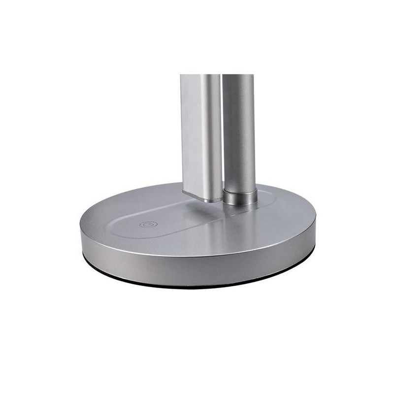 stolní lampička s LED světelným zdrojem, volitelná teplota světla (chromatičnosti): 3000K, 4500K, 6000K (teplá, neutrální a studená bílá), stmívatelná: 3-stupňové stmívání, příkon: max. 7W, světelný tok: max. 400lm, spínání a změna jasu dotykem prstu, napájení: vstup: AC 100-240V, výstup: DC 12V, energetická třída: G, LED zdroj nelze měnit, materiál: hliník, rozměr: 430 x 320 x 140mm, délka napájecího kabelu: 180cm, barva: stříbrná